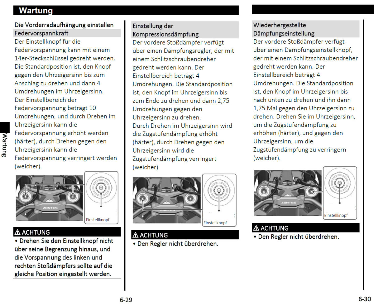 Mittlerweile bin ich mit der Zontes gut eingefahren und wir können uns mal dem Fahrwerk widmen. Also erstmal das Handbuch checken – Abschnitt 6-29 (Seite 81 in der pdf).
